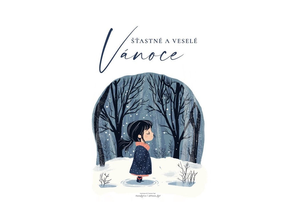 Elegantní vánoční přání s jemnou zimní ilustrací dívky procházející zasněženou krajinou. Motiv tichého zimního lesa a padajících sněhových vloček vytváří kouzelnou, lehce nostalgickou atmosféru.