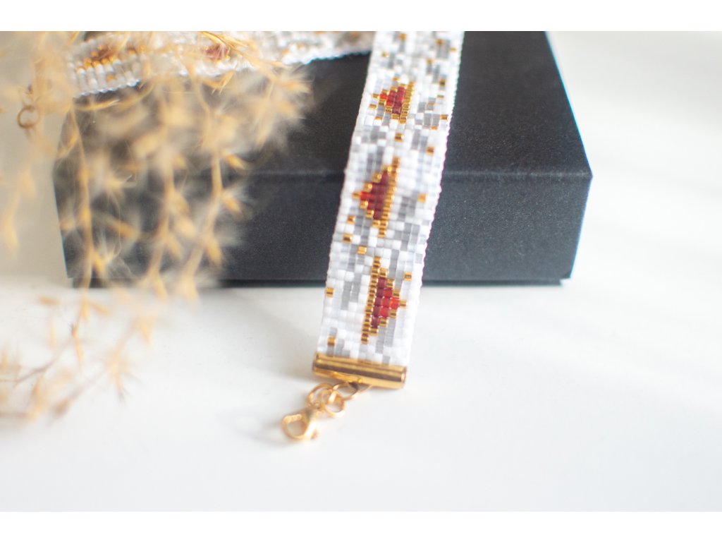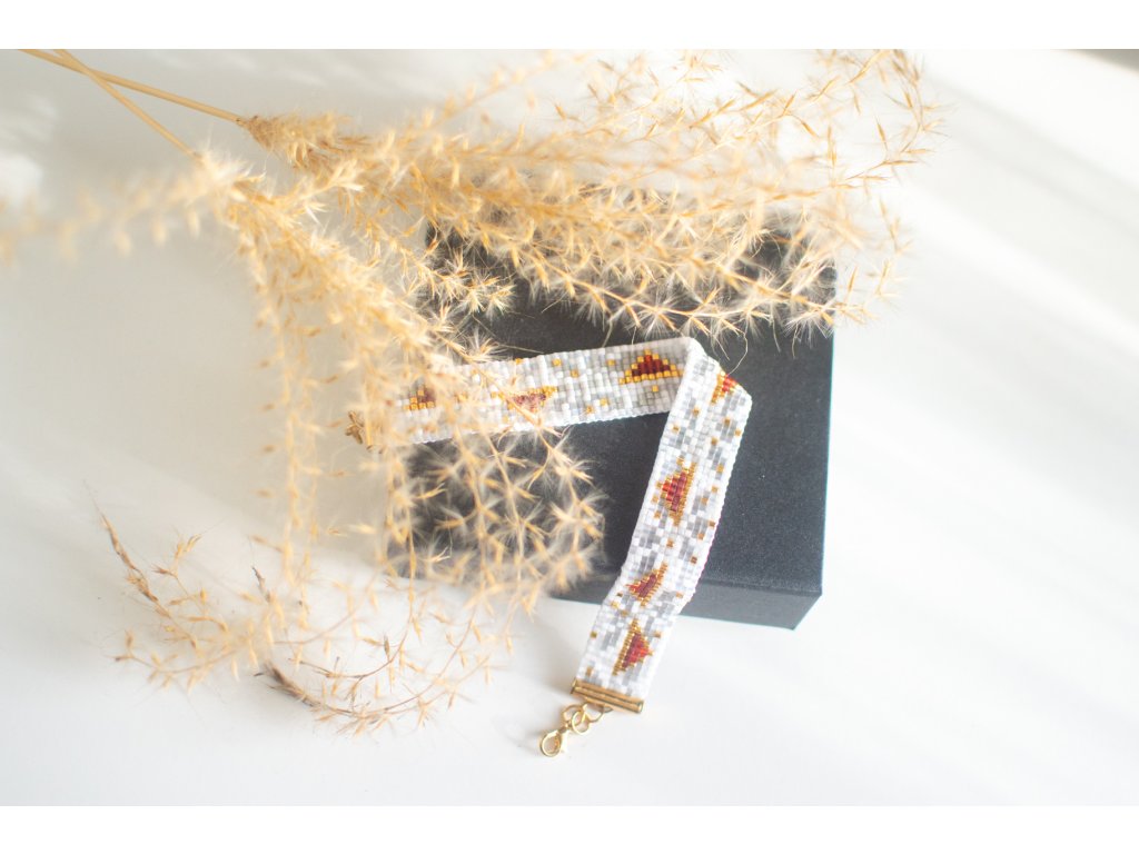 Tento ručně tkaný korálkový náramek spojuje čistotu bílých a šedých tónů s hřejivými zlatými detaily. Jemný geometrický vzor působí moderně, ale zároveň nadčasově, takže se skvěle hodí k elegantnímu i volnočasovému outfitu.