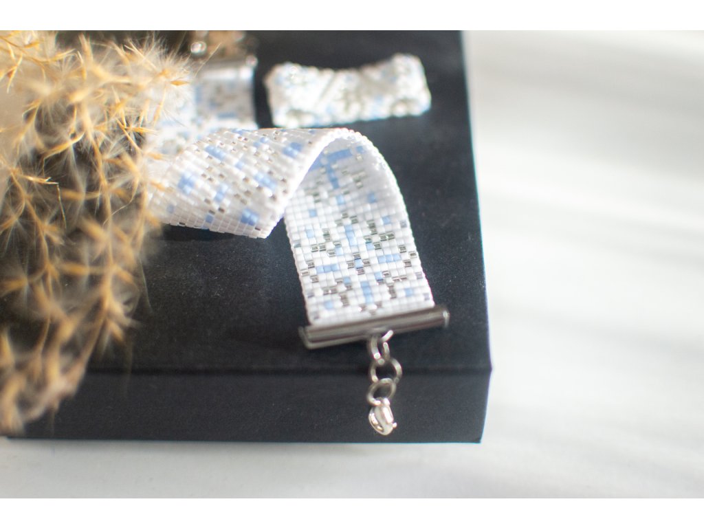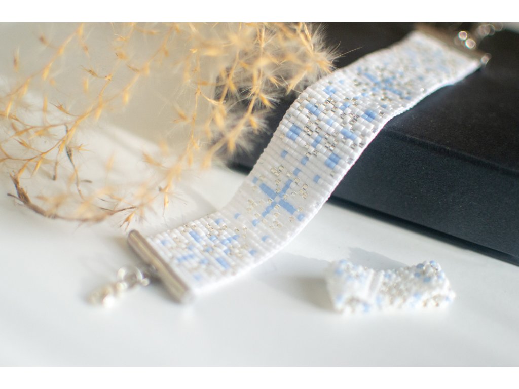 Tento ručně tkaný náramek je vytvořen z prvotřídních japonských korálků, které se vyznačují dokonalou pravidelností a jemným leskem. Bílá a perleťová barva v kombinaci se světle modrými akcenty vytvářejí nádherný zimní motiv připomínající vločky či ledové vzory.