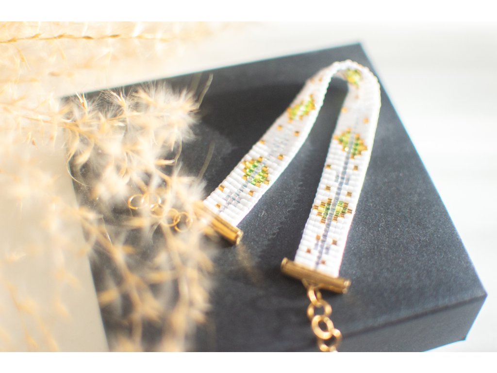 Elegantní ručně vyráběný náramek z japonských korálků s jemným zeleno-zlatým vzorem. Bílý základ a zlaté kovové zakončení dodávají šperku svěží a luxusní vzhled.