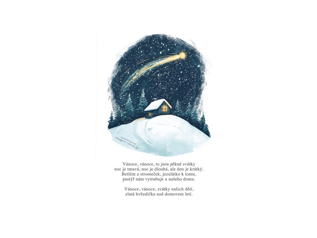 Přání, které nese vůni zasněženého návrší a tichý šepot hvězd. Teplé světlo chaloupky pod jasnou kometou doprovází tradiční vánoční verše, jež v sobě mají něco z dávných večerů u kamen. Ideální pro ty, kteří chtějí poslat kapku nostalgie, klidu a opravdového svátečního tepla. ✨